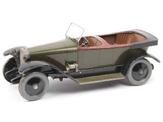 longueur 34 cm - avec moteur à clef (à revoir) & direction par le volant - nombreuses restaurations avec parties non d'origine & repeintes (notamment les roues) - quelques manques (dont une partie de châssis arrière découpée) - la carrosserie est en état 'B'