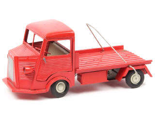 longueur 40 cm - avec moteur à clef (fonctionne), phares électriques (non testé, sans ampoule) & direction - manque benne & fixations - quelques fixations non d'origine - légères déformations par endroits
