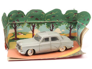 longueur 25 cm - avec moteur à pile, éclairage électrique (à revoir), direction & toit ouvrant - légère déformation de la carrosserie (plus ou moins tachée & encrassée) - manques quelques vis de châssis (d'autres non d'origine) & certaines baguettes - parties chromées plus ou moins altérées - un support de roue fêlé - couvercle de boîte manquant