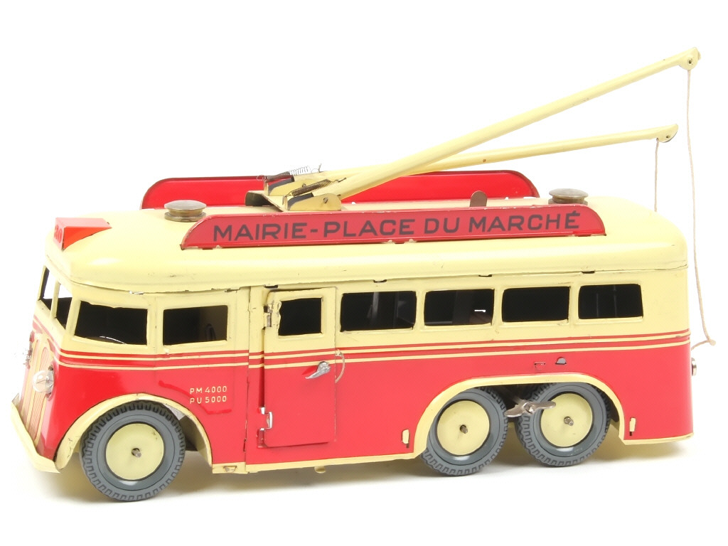 JOUSTRA (FRANCE) Trolleybus mécanique en tôle lithographiée 'MAIRIE-PLACE DU MARCHE' crème & rouge