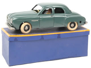 longueur 31,5 cm - version avec calandre à 3 barres, moteur à clef (fonctionne), direction, porte conducteur ouvrante, conducteur & phares électriques (non testés) - quelques micro-frottements sur le plancher par endroits - modèle proche de l'état 'A+' - boîte tachée & légèrement gondolée (avec pastille de couleur & notice d'utilisation de la pile collée sous le couvercle) - EN UN MOT : SUPERBE !
