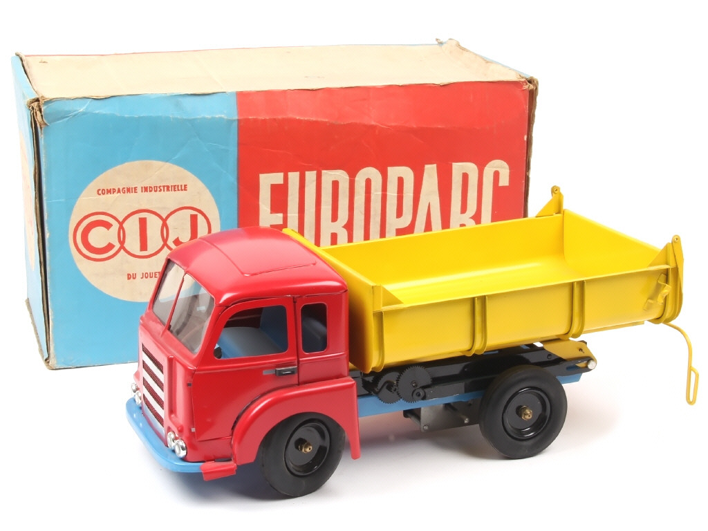 longueur 34 cm - avec moteur à clef (fonctionne), direction, benne basculante par manivelle & portières ouvrantes - boîte sans référence (encrassée) - SUPERBE !