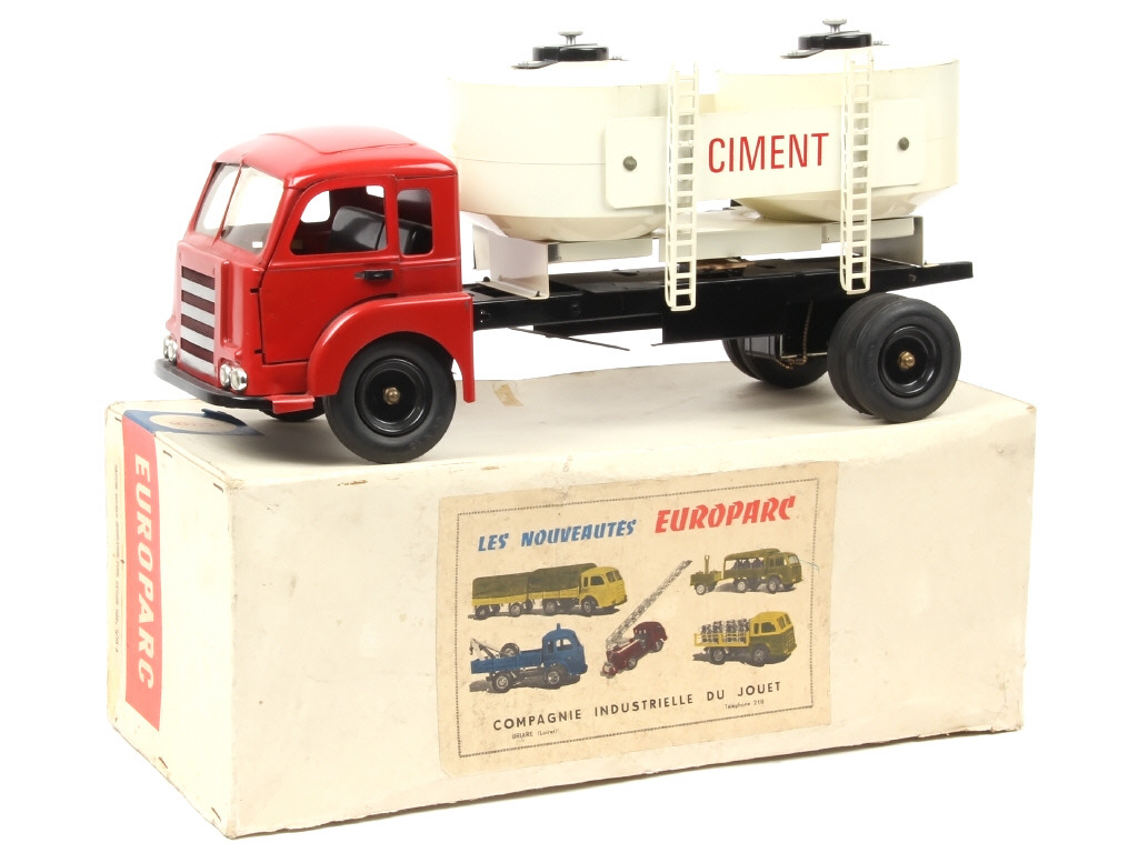 longueur 41 cm - avec moteur à pile (fonctionne), direction & portières ouvrantes - une petite fixation ajoutée sur le moteur - l'état est principalement dû à des petits frottements sur la carrosserie par endroits (2 plus importants sur l'arrière d'une citerne) - boîte encrassée avec accrocs & petites déchirures