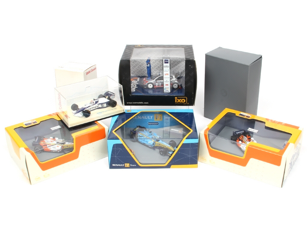 comprend les modèles : 206 rallye, BMW-BRABHAM, BMW M1 PROCAR & RENAULT - on y retrouve la marque IXO - une fêlure sur un couvercle de boite