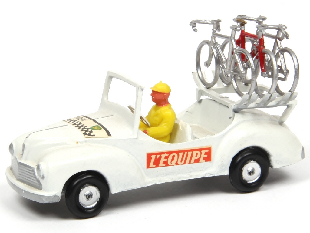 publicités 'L'EQUIPE, PEUGEOT - BP' - avec conducteur & 3 vélos - manque fanions - petit défaut de fixation du porte-vélos