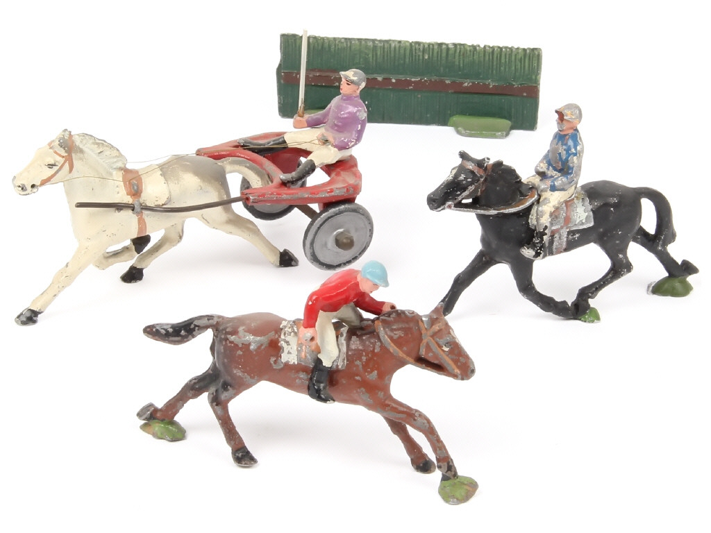 QUIRALU (FRANCE) Ensemble de 3 jockeys, 3 chevaux & un sulky