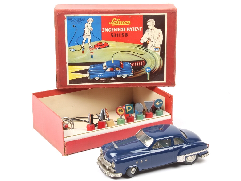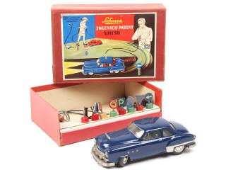 dimensions du coffret : 26,5 x 17 cm - non testé - contient : une voiture, une télécommande à distance, des panneaux de gymkhana & des outils (manque quelques petits accessoires & d'autres non d'origine, petites restaurations par endroits avec légères retouches) - petites rayures sur le vitrage (légèrement déformé par endroits)