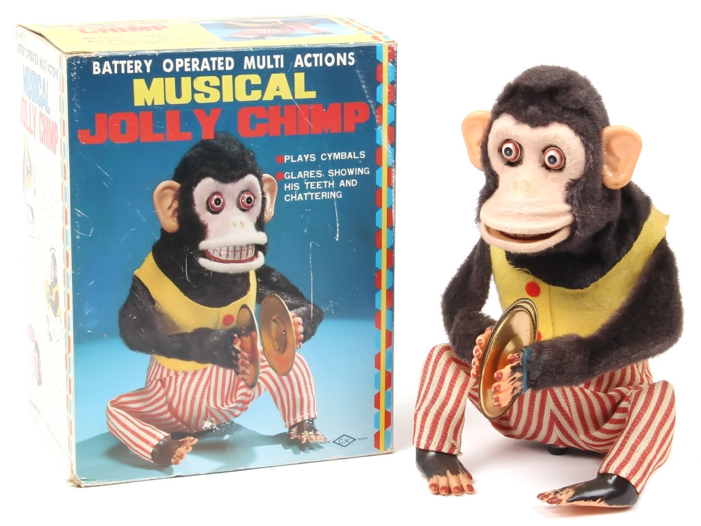 hauteur 24 cm - en action le singe joue des cymbales - lorsque l'on appuie sur la tête l'animal montre ses dents, ses yeux sortent des orbites & il pousse de petits cris - mécanismes fonctionnent (de manière aléatoire) - boîte avec quelques accrocs