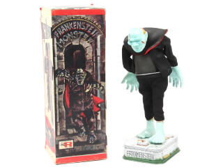 hauteur 32 cm - mécanismes à piles (fonctionnent poussivement) - en action le monstre bouge les bras puis après un court instant son pantalon tombe tandis qu'il pousse quelques cris - quelques petits accrocs sur la boîte
