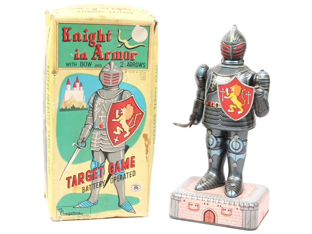 hauteur 30 cm - mécanismes à piles (fonctionnent) - en action le chevalier lève son épée & son heaume s'éclaire lorsqu'une flèche touche son bouclier (manque arc & flèches) - épée légèrement déformée - quelques petits frottements par endroits - boîte endommagée