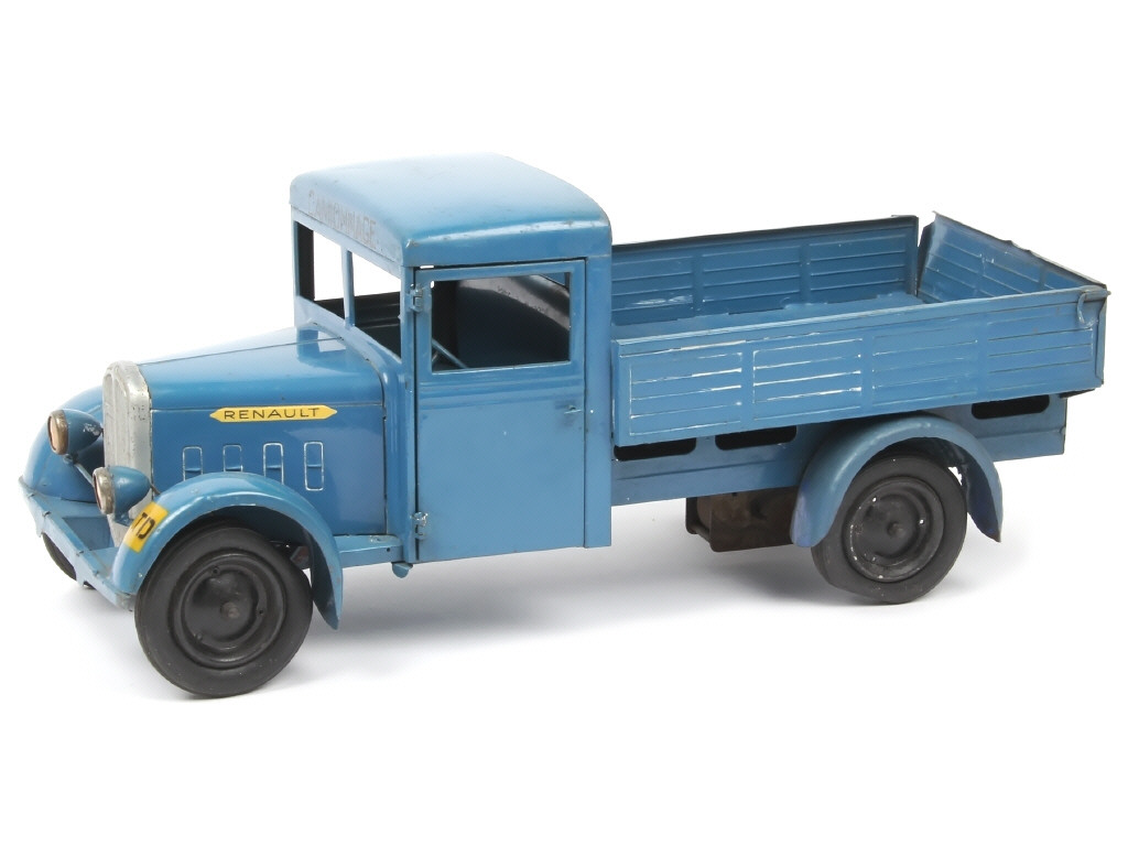 longueur : 43 cm - avec moteur à clef (fonctionne), phares électriques (non testés) & direction (sans accessoire) - inscriptions au pochoir 'CAMIONNAGE' (en lettres noires) sur le fronton de cabine, 396-17-CIJ sur l'arrière du plateau & 'TD' sur l'aile avant gauche - légères déformations par endroits (notamment sur la ridelle basculante, manque une fixation) - une aile restaurée & repeinte - pneus séchés & affaissés - logement à pile oxydé - traces de produit lustrant sur l'ensemble de la carrosserie (frottements & petites rayures par endroits)