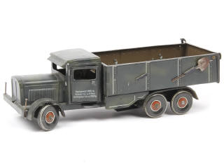 longueur : 27 cm - avec moteur à clef (fonctionne), direction, ridelle arrière basculante, portière ouvrante & 2 soldats - quelques frottements par endroits notamment sur les ridelles - avec 2 pelles (quelques traces d'oxydation, 2 exemplaires manquants)