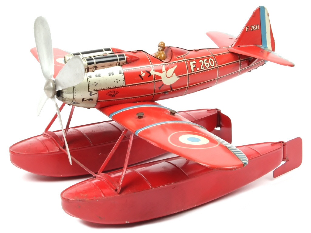 modèle réalisé en 1934 - envergure 48 cm - moteur à clef (fonctionne) - arrière du poste de pilotage repeint - quelques frottements plus ou moins importants par endroits (notamment sous les flotteurs avec quelques petites traces d'humidité)