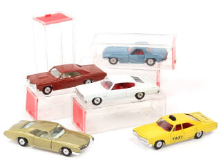 états de 'A' à 'B' - comprend les modèles : CHEVROLET CORVETTE, TAXI, PONTIAC GTO, DODGE CHARGER & BUICK RIVIERA (un petit défaut de moulage sur le volant) - avec boîtes cristal (sans socle cartonné avec quelques petites fêlures)
