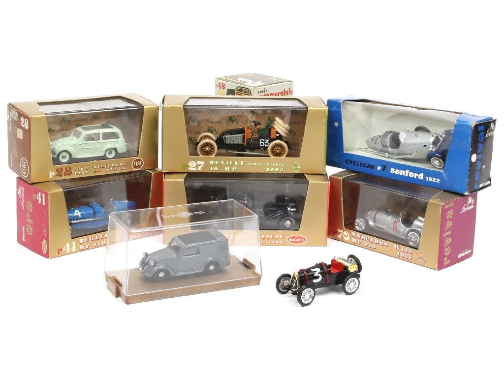 miniatures reproduisant notamment les modèles : FIAT, SANFORD, RENAULT & BUGATTI (un exemplaire sans boîte) - un exemplaire désolidarisé de son socle - une boîte en état 'c'