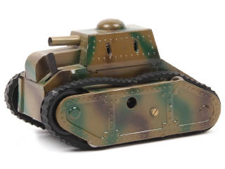 longueur : 16,5 cm - avec moteur à clef (fonctionne) - quelques frottements plus ou moins importants par endroits (dont certains majeurs) - chenilles non d'origine (coupées & recollées) - canon retouché avec mécanisme de tir non d'origine