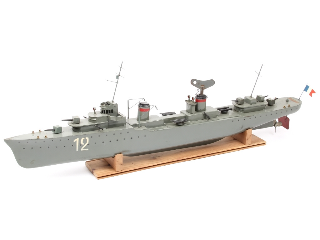 longueur 75 cm - avec moteur à clef (fonctionne) & clef (non d'origine) - gouvernail légèrement restauré - très légères retouches avec quelques petites déformations & frottements plus ou moins importants par endroits - bannière non d'origine - manque câblages