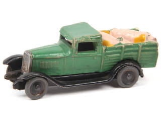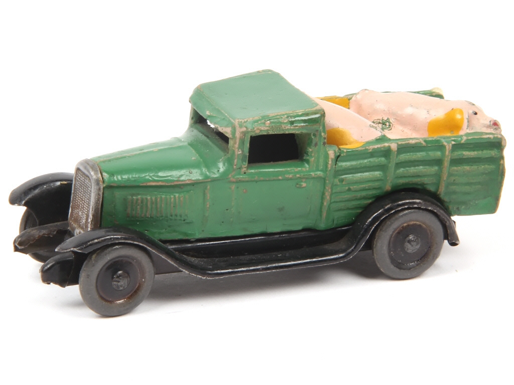 réalisation en plâtre & farine avec châssis en tôle & roues en métal - longueur : 9,5 cm - avec 2 cochons dans la benne - calandre recollée - agrafes arrière de plancher déficientes