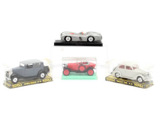 comprend : SIMCA 8, MERCEDES de compétion (boîte non conforme avec petites parties fondues sur le socle), CITROËN ROSALIE & 5 HP