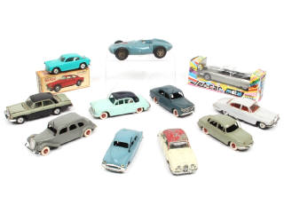 états de 'A' à 'R' - miniatures reproduisant les modèles : PANHARD, CITROEN (un exemplaire en boite état 'B' avec accrocs), RENAULT, MERCEDES & ALFA ROMEO (en boite état 'c') - quelques petits manques, accessoires non d'origine (antennes principalement) & petites cassures par endroits - on y joint une GORDINI de courses (échelle 1/32ème avec carrosserie plus ou moins déformée de la marque MINIALUXE)