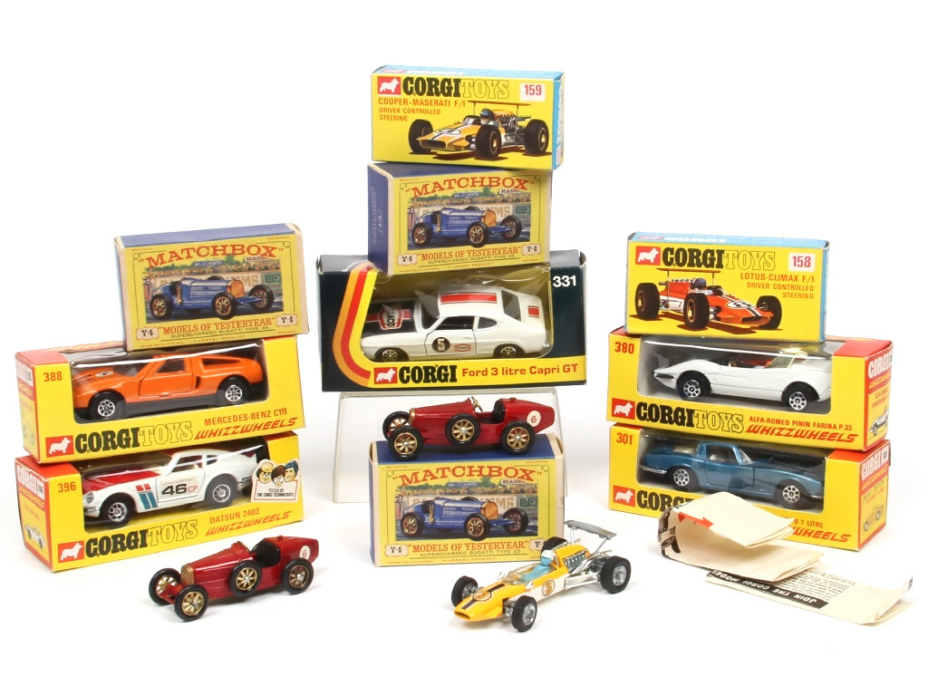 miniatures reproduisant les modèles : DATSUN, FORD, ALFA ROMEO, MERCEDES, ISO, LOTUS, COOPER MASERATI & BUGATTI - on y retrouve les marques : CORGI TOYS & MATCHBOX - quelques petits papiers artisanaux collés sur certaines carrosseries - certaines boîtes avec petites annotations, étiquettes collées ou manques de papier