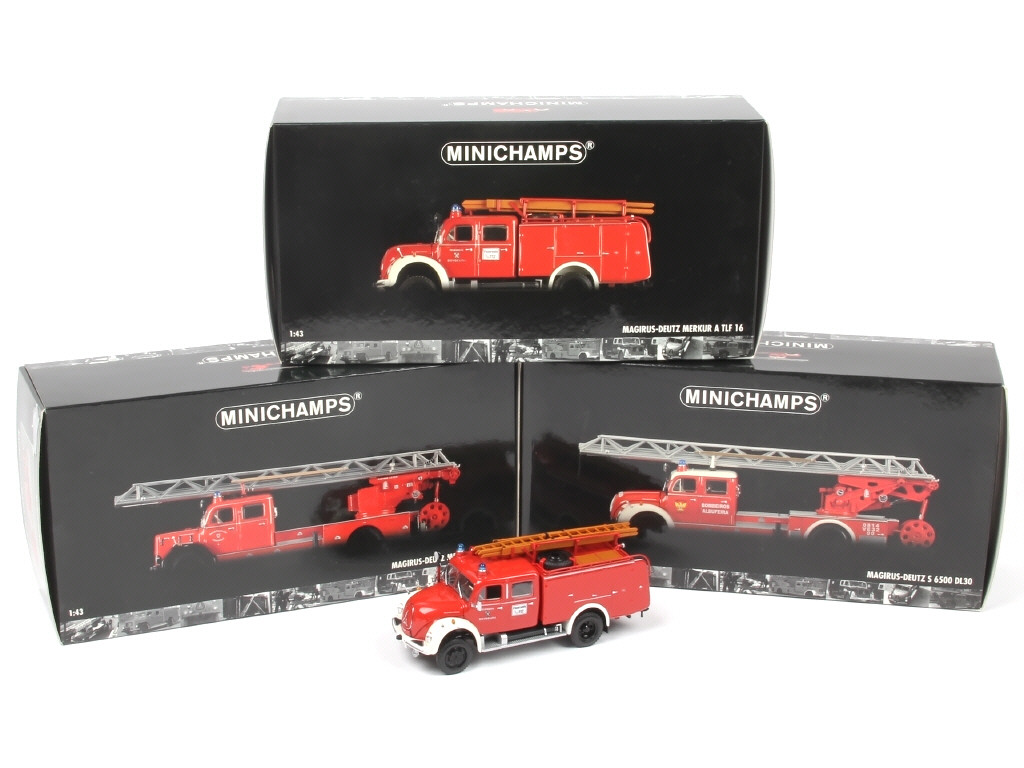 MINICHAMPS (ALLEMAGNE) Ensemble de 3 MAGIRUS DEUTZ de pompiers rouge