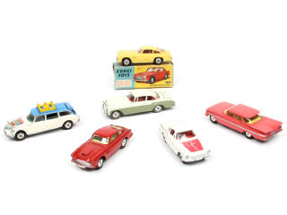 états de 'C' à 'D' - miniatures reproduisant les modèles : ASTON MARTIN DB4 (2 exemplaires dont un en boite état 'c'), CHEVROLET, BENTLEY (manque roue de secours - une fêlure sur la lunette arrière), VOLVO 1800 'LE SAINT' & CITROEN ID19 break 'GRENOBLE' (en état 'E' - avec manques) - pneus plus ou moins séchés & craquelés