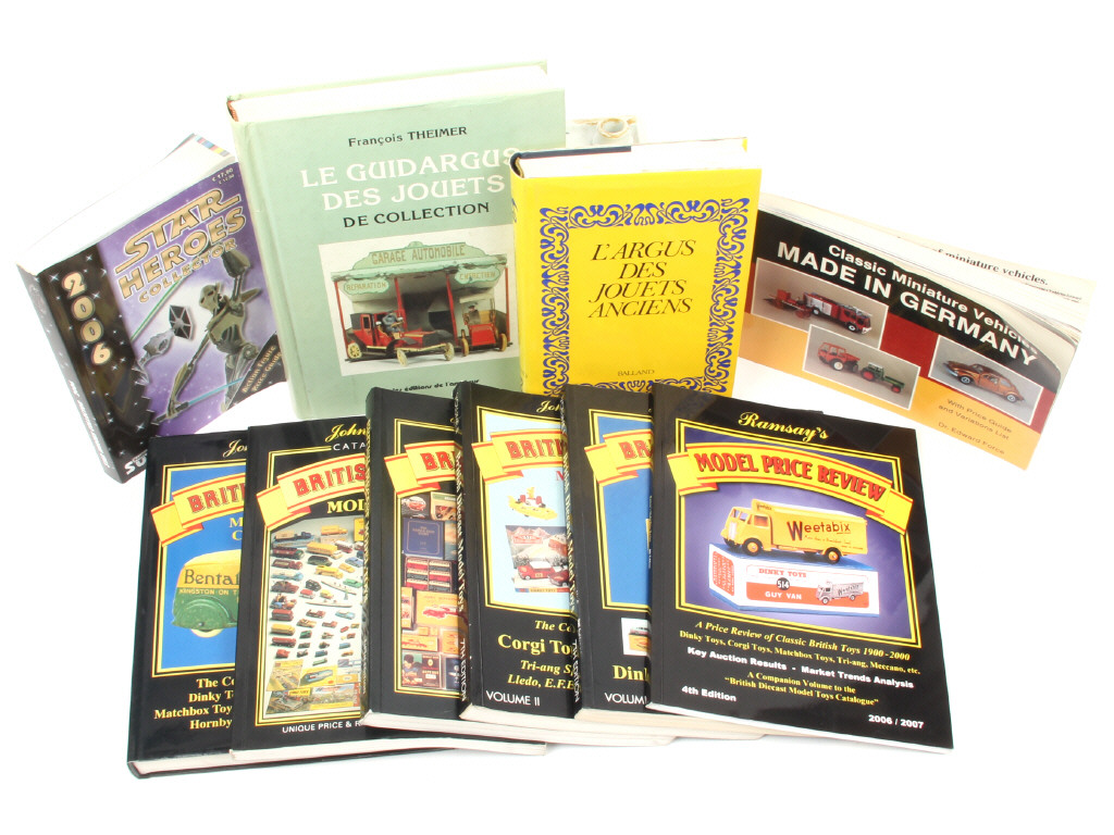 comprend : 6 éditions du 'BRITISH DIECAST MODEL TOYS, 'GUIDE ARGUS DES JOUETS DE COLLECTION, CLASSIC MINIATURE VEHICLES MADE IN GERMANY, L'ARGUS DES JOUETS ANCIENS & STAR HEROS COLLECTOR'
