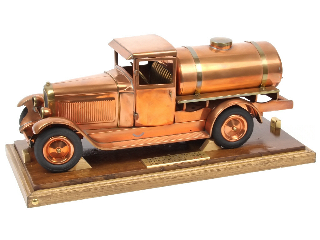 longueur : 44 cm - copie artisanale réalisée en cuivre & laiton du camion fabriqué par LES JOUETS CITROËN (référence 550) & proposé en série de 2 exemplaires (modèle n°2) - ce modèle est une reproduction fidèle dans les moindres détails à celui du véritable jouet (non motorisé) - il est présenté dans un coffret bois de très belle facture - MAGNIFIQUE PIECE !