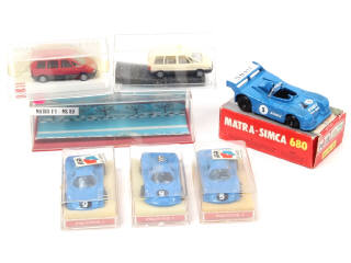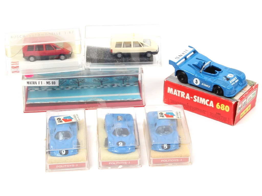 différentes échelles - comprend les modèles : MATRA (4 exemplaires différents) & RENAULT - on y retrouve les marques : POLISTIL, POLITOYS, PRALINE & BUSCH - on y joint une boîte vide de la marque MINIALUXE