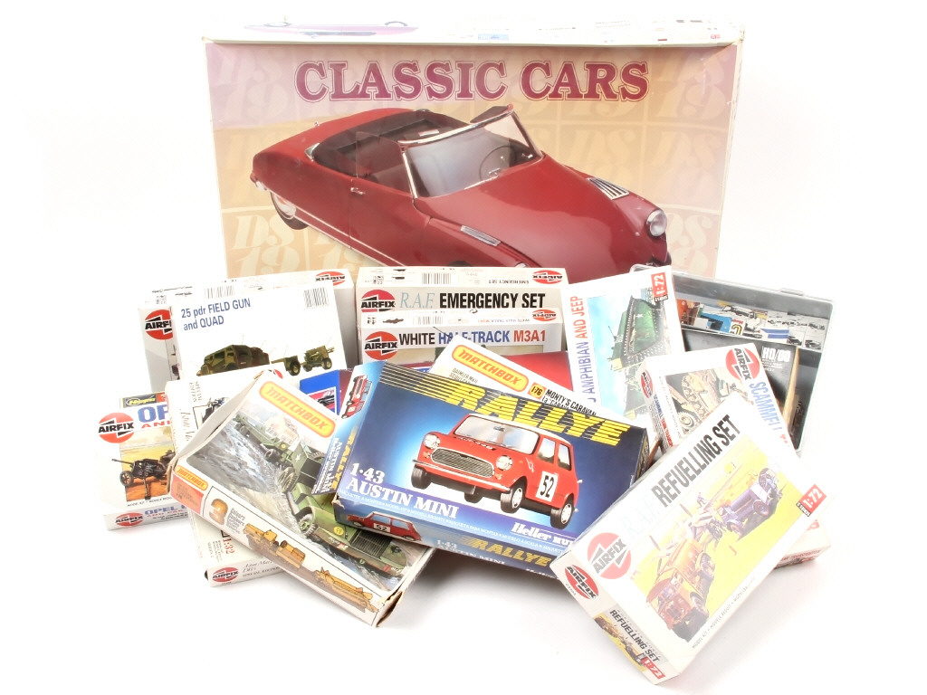 comprend notamment les modèles : CITROEN, OPEL & ASTON MARTIN - on y retrouve notamment les marques : HELLER, AIRFIX & HASEGAWA - possibilités de manques & parties cassées - on y joint une boîte de découpis