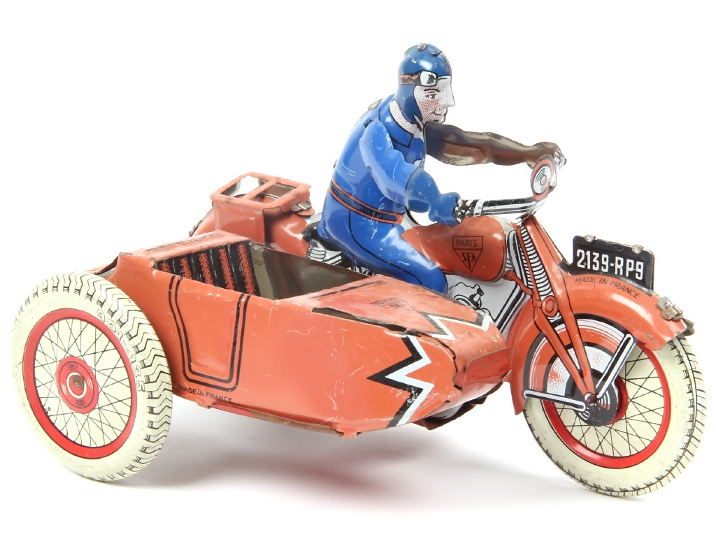 SFA PARIS (FRANCE) Moto avec side-car en tôle lithographiée brique clair & bleu