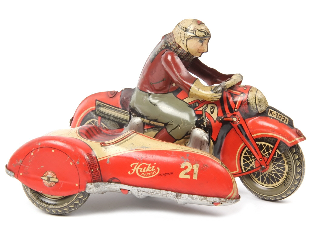 HUKI (ALLEMAGNE) K-1021 Moto avec side-car en tôle lithographiée rouge, brique & crème