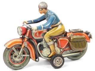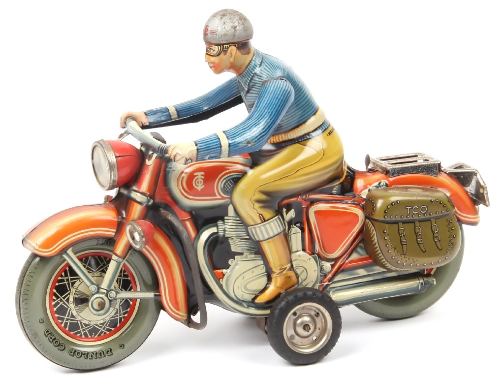 longueur 29 cm - moteur à friction (à revoir) - manque pare-brise & agrafes de fixation du bloc moteur (une fixation non d'origine) - quelques petites traces d'oxydation & parties légèrement ternies