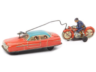 P.N. PHILIP NIEDERMEIER (ALLEMAGNE) Voiture avec motard de la police en tôle lithographiée 2 tons de bleu, rouge & crème