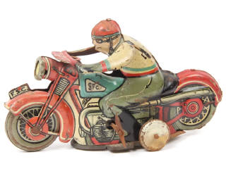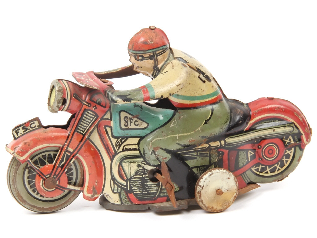 S.F.C (FRANCE) Moto de course en tôle lithographiée rouge, bleu & crème