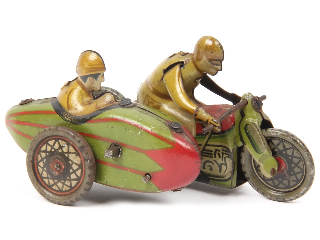 PAYA (ESPAGNE) Moto avec side-car en tôle lithographiée vert, jaune & rouge