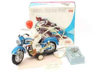 longueur 30 cm - avec permis de conduire & bon de contrôle - moteur à piles (non testé) - une sortie d'échappement cassée - fixation de guidon déficiente - petites traces de colle d'origine par endroits avec légers manques de peinture