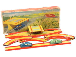 dimension du coffret 38x15 cm - contient : une piste avec station à essence, un rail droit, 4 courbes & 2 voitures (moteurs à clef fonctionnent, parties chromées ternies) - quelques frottements plus ou moins importants par endroits - légères traces d'oxydation