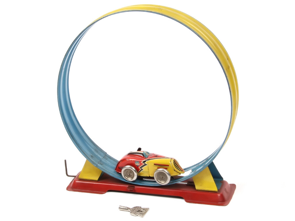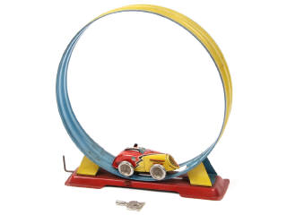 dimension : 25x25 cm - avec une voiture (moteur à clef fonctionne), clef & rampe looping avec ressort de propulsion (fonctionne, frottements plus ou moins importants) - en action, la voiture est propulsée à l'intérieur de la rampe (système difficilement fonctionnel)