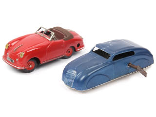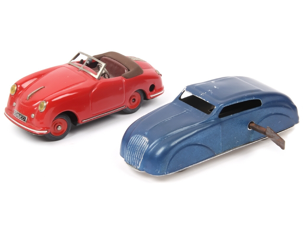 'SPORT EXAMICO' - longueur 15 cm - avec moteur à clef (fonctionne), levier de changement de vitesses & direction par le volant - pare-brise très légèrement déformé & dégrafé - on y joint un coupé en tôle peinte (longueur 17 cm) avec direction & moteur à clef fonctionne (état 'C', frottements importants sur le haut de la carrosserie) non d'origine
