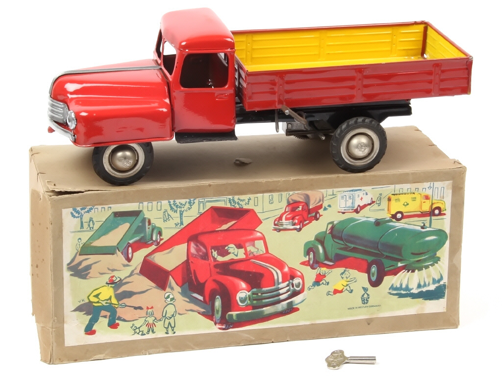 B.S (ALLEMAGNE) 87/169 Camion plateau à ridelles basculant en tôle peinte rouge, jaune & noir