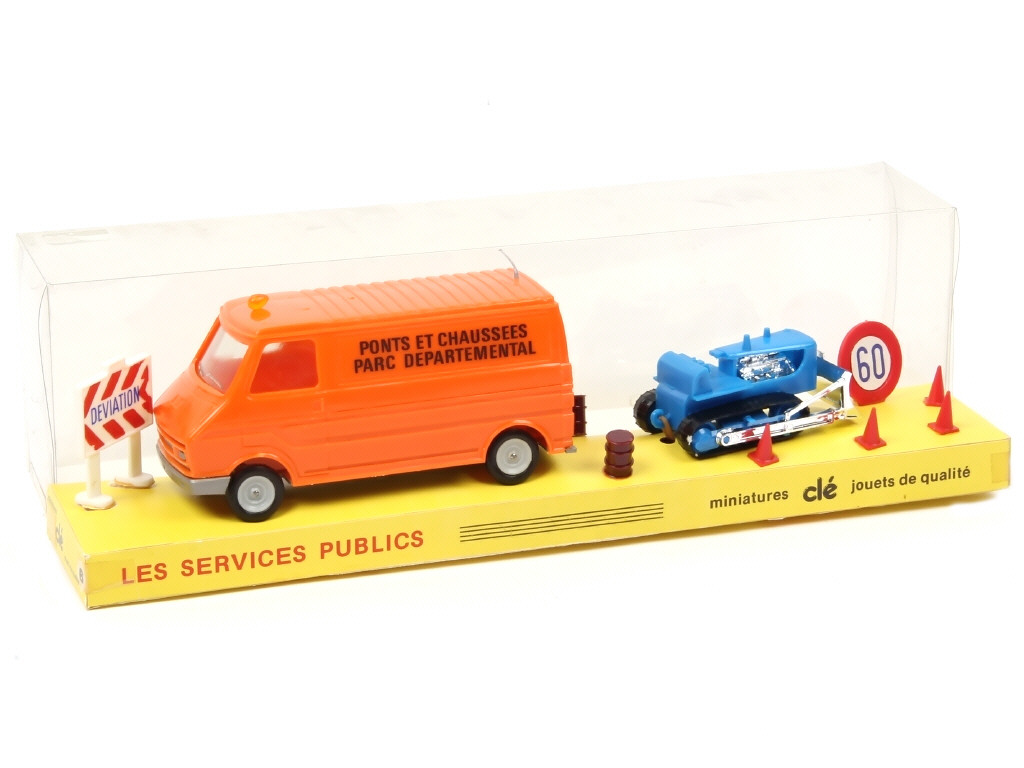 échelle 1/32ème - contient : CITROEN C35 'PONTS ET CHAUSSEES PARC DEPARTEMENTAL', un bulldozer, 2 panneaux (dont un décollé), 4 cônes & 2 fûts - socle légèrement déformé