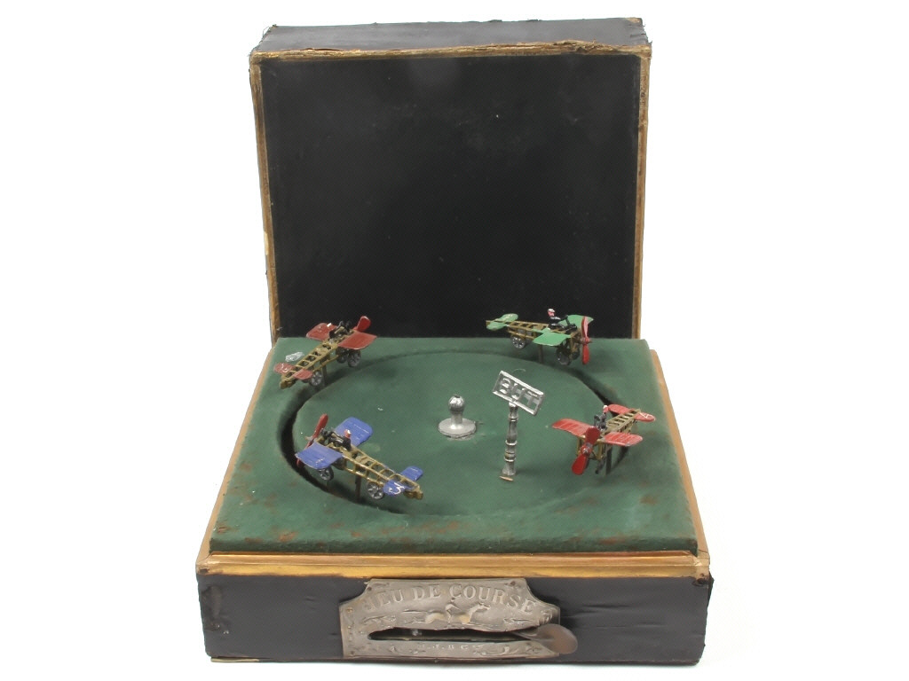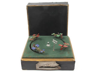 dimensions : 26,5 x 26,5 cm - fonctionne - nombreux frottements sur la boîte avec manques de papier - petites déformations du support de plateau centrale & de quelques parties - feutre plus ou moins taché - certains accessoires manquants