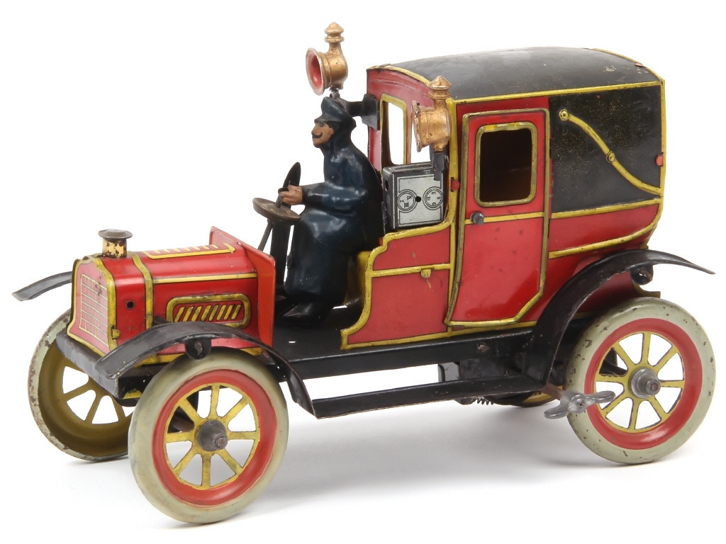 longueur : 19 cm - avec moteur à ressort (fonctionne), direction, chauffeur & portières ouvrantes - avec petites restaurations, certains éléments repeints (dont une roue) & retouchés - quelques petits manques