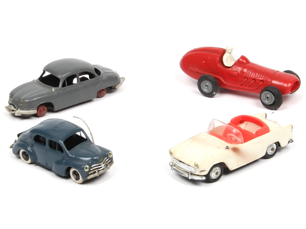 comprend les modèles : RENAULT (moteur à revoir), PANHARD & SIMCA (carrosserie tachée) - on y joint une FERRARI de courses de la marque TRIANG (moteur à friction à revoir - pneus endommagés) - avec manques & parties cassées