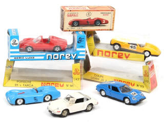 miniatures reproduisant les modèles : FERRARI, PORSCHE, MERCEDES (un exemplaire avec carrosserie légérement déformée) & LIGIER - 2 décorations ajoutés sur 2 exemplaires - les boites sont en état de 'b' à 'e' (avec quelques annotations)