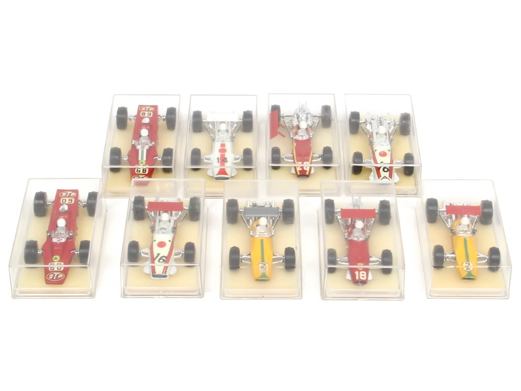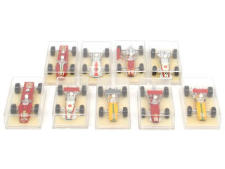 miniatures reproduisant les modèles : HONDA, LOTUS (dont un exemplaire en état 'B'), Mc Laren & FERRARI - quelques parties chromées plus ou moins altérées