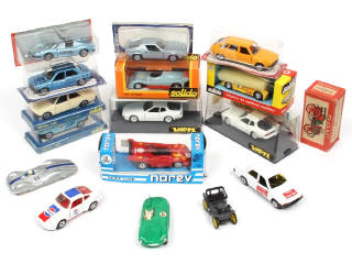miniatures reproduisant notamment les modèles : FERRARI, PORSCHE, ALFA ROMEO & LOLA - on y retrouve les marques : NOREV, SOLIDO, VEREM, J.M.K (avec parties cassées & manquantes), MINIALUXE & QUIRALU (état 'R') - les boîtes sont en état 'b' dont certaines avec accrocs (4 exemplaires sans boîte)