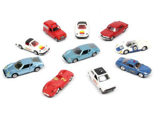 4 exemplaires de la série JET-CAR - miniatures reproduisant les modèles : FERRARI, MASERATI, PORSCHE, RENAULT, LIGIER - quelques petites déformations